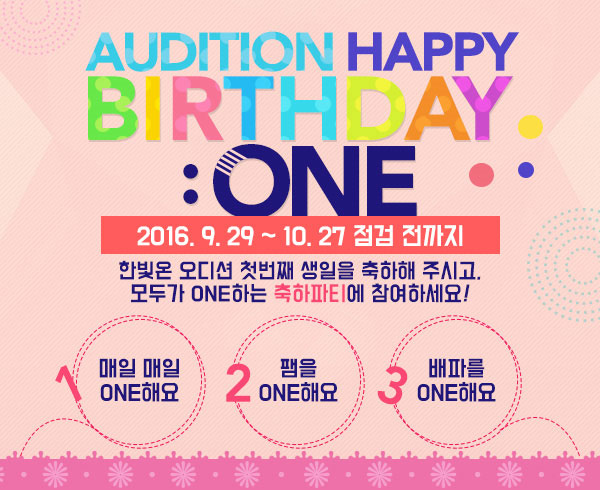 ... 이번 한빛온 오디션 1주년 기념 이벤트는 ▲매일매일 One해요 ▲팸을 One해요 ▲배파를 One해요 총 3가지로 구성된다. '매일매일 One해요'는 출석 체크 이벤트다. 이용자는 게임 내 출석 버튼 클릭 후 2시간동안 게임을 하면 보상을 받을 수 있다