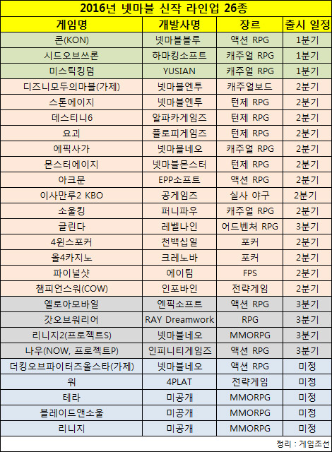 ... 이 행사는 지난해 7월에 이어 두 번째로 개최된 것으로 2016년 선보일 계획인 26종의 신작을 소개하고 넷마블의 미션에 대해 이야기했다. 약 두 시간의 행사 동안 방준혁 의장을 비롯해 권영식 대표, 백영훈 사업전략 부사장, 이승원 글로벌전략 부사장 등은 모두 하나같
