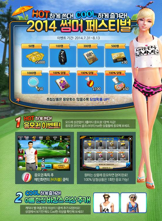 ... 이와 함께 100% 당첨 상품이 포함된 응모권 이벤트도 함께 진행한다. 일반모드나 대회모드에서 3홀 라운드를 완주할 때마다 응모권이 1장씩 지급되며, 이 응모권으로 캐디백, 캐시 등 고가의 아이템 추첨에 도전하거나 강화행운권, 100M티핀 100개 등 100% 지급 아이템을