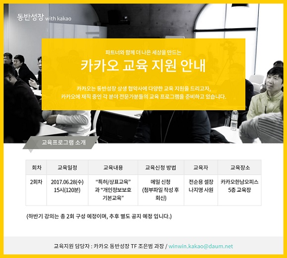 ...2차 프로그램은 ‘특허, 상표 등록’과 ‘개인정보 보호’라는 주제로 28일 오후 3시부터 카카오 한남오피스에서 진행된다. ‘특허, 상표 등록’은 카카오의 지적재산권 업무를 담당하는 전순용 셀장이, ‘개인정보 보호’는 카카오에서 이용자들의 개인정보보호 업무를 담당하는 나지영 사원이