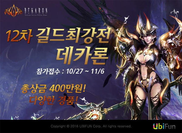 ... 대회는 총 400만원 상금과 날개, 무기 아이템 등이 제공되고 11월 18일부터 12월 3일까지 진행된다. 최종 결승전은 서울 상암동 상암 에스플랙스에서 진행되고 이날 현장에서는 게임의 향후 서비스 계획 등에 대해서도 발표될 예정이다. 이봉재 유비펀 본부장은 “데카