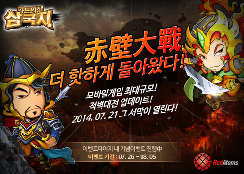 ... 각 국가에 소속된 동맹군들끼리 미리 전략을 짜고 필요 시 높은 레벨 동맹군이 낮은 레벨 동맹군에 지원군을 파견하는 등 카드의신삼국지의 특징인 전략 요소를 충분히 발휘해야 하는 국가 전으로 펼쳐진다. 총 4주간 진행되는 이번 업데이트는 24일 시작하며 지난 7월 10일 대표 동