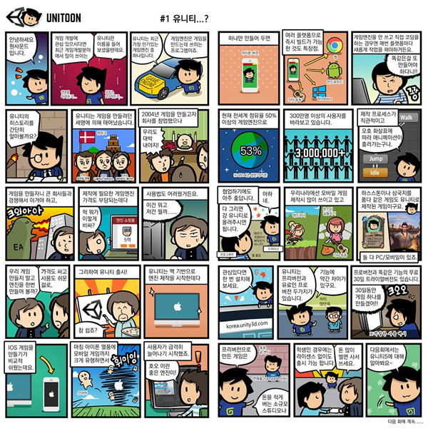 ... 유니티 코리아 양우형 대표는 “이번 웹툰을 통해서 유니티에 대한 이해를 도와드릴 수 있게 되어 기쁘다”이라며, “앞으로도 지속적인 스토리텔링을 통해 유니티만의 가치를 전달해 나갈 것”이라고 전했다. 한편 다음화에서는 유니티 5에 대한 내용을 선보일 예정으로 향후 지속적으로
