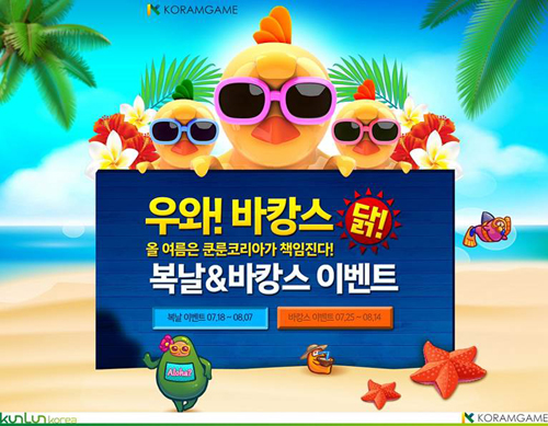 ... 1등~4등 당첨시 VIPS 주말 식사권, KFC 치킨 스마트초이스 기프티콘, 게임 캐시, 복날 패키지 아이템을 수령할 수 있는 리딤코드 등의 경품을 받을 수 있다. 이벤트는 매일 1번 참여할 수 있고 초복, 중복, 말복(7/18, 7/28, 8/7)에는 2번씩 참여할 수 있다.