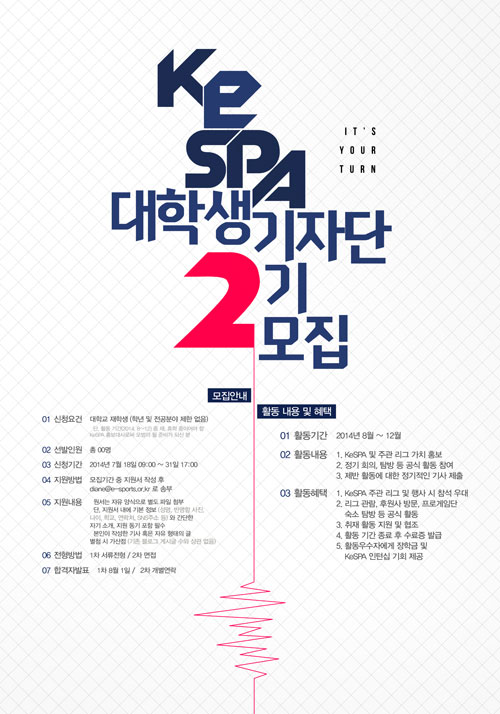 ... 지난 3월 14일에 발대식을 가졌던 1기는 6월 27일 구성원 전원이 수료 기준을 달성하는 등의 활발한 활동으로 KeSPA와 주관 리그 및 e스포츠 전반의 가치를 높이는데 큰 역할을 했으며, 이번 2기 역시 현장에서 다양한 활동을 함께 할 의지를 가지고 있는 대학생을 모집할 예