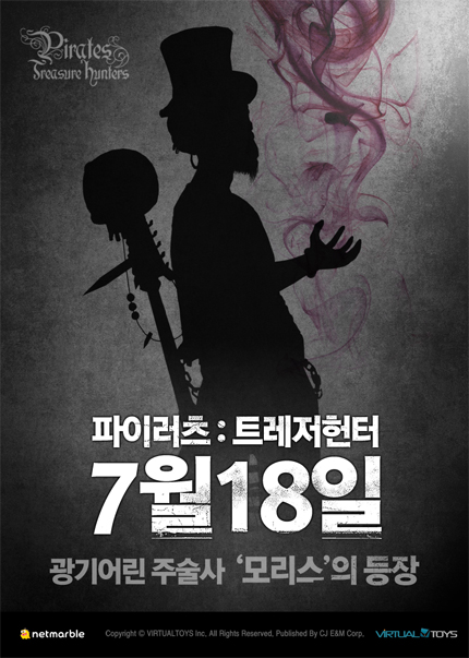 ... ‘파이러츠 : 트레저헌터’의 서비스를 담당하고 있는 넷마블 직원들이 모리스 캐릭터를 사용해 이용자들과 함께 게임을 즐길 예정으로 이벤트 시간 중 이 캐릭터를 만나는 모든 이용자들은 넷마블 PC방 무료 이용 쿠폰을 받을 수 있다. 넷마블 임형준 본부장은 “현재 테스트는 22종