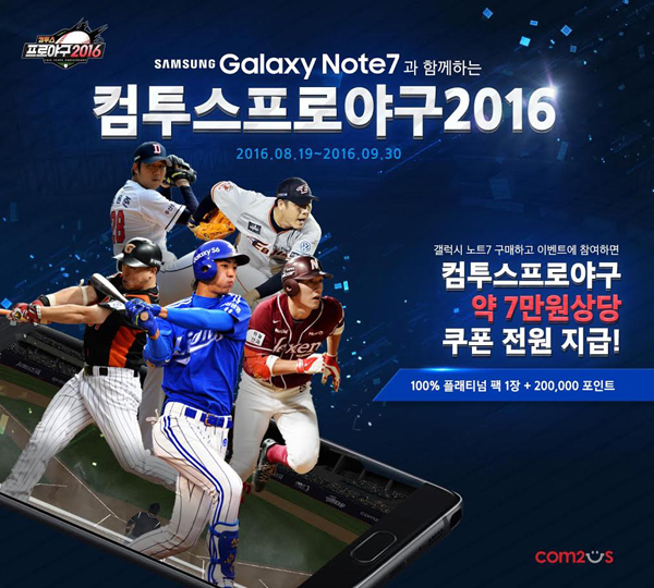 ...해당 기간 동안 갤럭시노트7을 구매한 고객 전원에게 인기 모바일 야구게임 '컴투스프로야구2016'(이하 컴프야2016)의 게임 아이템을 선물로 제공한다. 갤럭시노트7의 기본 탑재 어플리케이션인 'Samsung Members'에서 '컴프야2016' 플래티넘 선수팩과 게임 재화 등