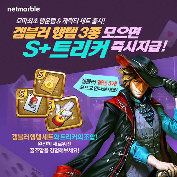 ... 이 캐릭터는 S+트리커 카드와 세트로 출시된 겜블러 신규 행운 아이템 3개를 모으면 S+트리커를 100% 지급받을 수 있다. 행운 아이템과 캐릭터를 조합하면 능력치가 크게 향상된다. 넷마블 측은 이번 캐릭터 출시를 기념해 오는 23일까지 친구에게 클로버를 받으면 다량의 재화