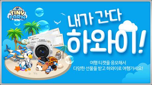 ... 또한 이벤트 페이지에 접속해 미션 보상으로 얻은 여행 티켓을 경품에 응모하면, 추첨을 통해 하와이 여행 상품권, 캐논 DSLR 카메라, 닷드랍스 캐리어, 백화점 상품권 등을 증정한다. 더불어 게임 머니 5천 골드, 게임 캐시 20벨, 타이니알 등 선물함으로 바로 지급되는 다양