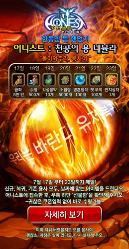 ... 어니스트는 오는 23일(수)까지 신규 및 복귀유저, 기존유저를 대상으로, 게임에 접속만 해도 17일(목) 게임캐시 5천만, 18일(금) 수정 500개, 19일(토) 속성증가 물약10개 등 게임 진행에 도움이 되는 매일 다른 보상아이템을 증정한다. 정호영 레쿠코리아 대표는"