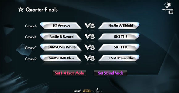 ... KT애로우즈는 나진실드를 뽑았고, 나진소드는 SKT S, 삼성화이트는 SKT K, 삼성블루는 진에어스텔스를 맞상대로 확정지었다. 이어 SKT S는 B조, SKT K는 C조, 나진실드는 A조, 진에어스텔스는 D조를 선택하며 조추첨식이 마감됐다. 8강은 5전 3선승제로 오는