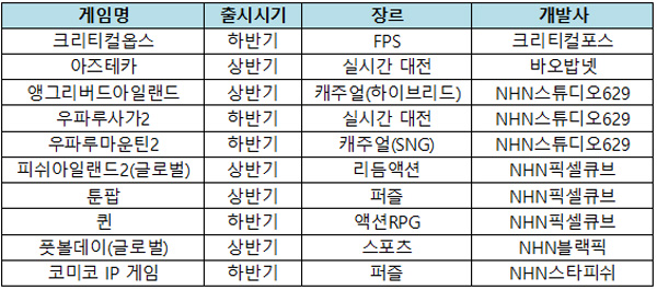 ... 현재 상반기에 출시될 것으로 보이는 작품은 실시간대전 '아즈테카', 캐주얼게임 '앵그리버드아일랜드', 퍼즐게임 '툰팝' 등이다. 한편 NHN엔터테인먼트의 2016년 게임 매출은 4729억원으로, 모바일부문 2773억원, PC온라인부문 1956억원을 기록했다.
