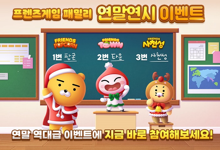 ... 각 게임 캐릭터의 선물은 치킨, 피자, 타르트 등 다양한 먹거리로 구성됐다. 또한 내년 1월 10일까지 이모티콘 지급 및 보너스 이벤트도 진행된다. 프렌즈팝콘, 프렌즈타운, 프렌즈사천성에서 각각 하트 24개씩 소진할 경우, 각각 ‘냥춘이’, &lsq