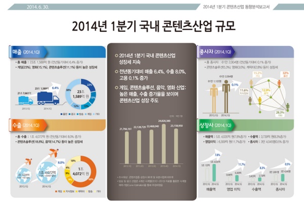...6% 증가한 8506억800만원으로, 전체 콘텐츠산업 수출의 60% 이상을 차지한 것으로 나타났다. 올 1분기 우리나라 콘텐츠 산업 전체 매출액은 지난해 동기대비 1조4000억원 늘어난 23조2000억원으로 조사됐으며, 수출액은 1000억 원 증가한 1조4000억원으로 집계,