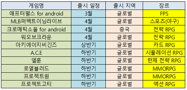 ... 또 기대작 '아키에이지비긴즈'가 상반기 내 글로벌 서비스를 시작할 계획이고, 하반기에는 MMORPG '로열블러드', 전략 RPG '엘룬', 3D MMORPG '프로젝트원', 프로젝트GOTY 등이 출시될 전망이다. 한편 게임빌은 2016년 매출 1623억원, 영업이익 46억