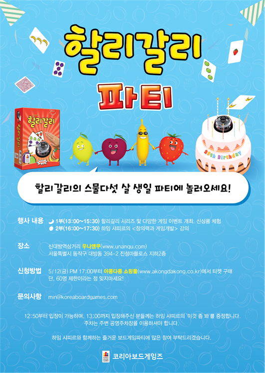 ... 생일 파티 외에도 온라인 상에서 할리갈리의 추억과 관련된 다채로운 이벤트가 진행된다. 할리갈리를 소재로 한 재미있는 동영상을 제작하는 UCC공모전과 할리갈리와 함께 했던 추억이 담긴 글이나 사진, 그림, 동영상을 SNS에 공유하는 스토리텔링 공모전이 그것이다. 마지막