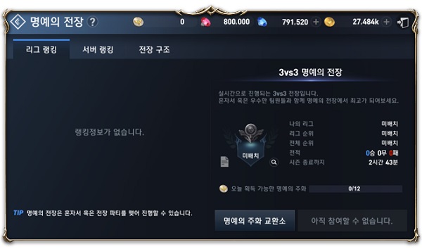 ... 명예의 전장 정규 시즌은 티어별 리그가 적용된다. 브론즈, 실버, 골드, 플래티넘, 다이아, 마스터, 그랜드 마스터, 레전드 순서로 티어가 상승하게 되며, 브론즈부터 다이아까지는 1~3단계로 또 한번 나뉘어 진행된다. 가장 낮은 티어인 브론즈은 최소 점수 900점으로 시