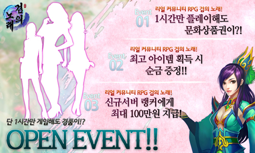 ... 검의노래는 정식 서비스를 기념하여 오는 13일(일)까지 40레벨을 달성한 선착순 1,000명에게 문화상품권을 증정하며, 공격력이 가장 강력한 아이템을 소지한 5명에 순금 1돈을 증정하는 이벤트를 실시한다. 또한, 전투력 순위 1~10위에 해당하는 유저에게는 최대 100만원을