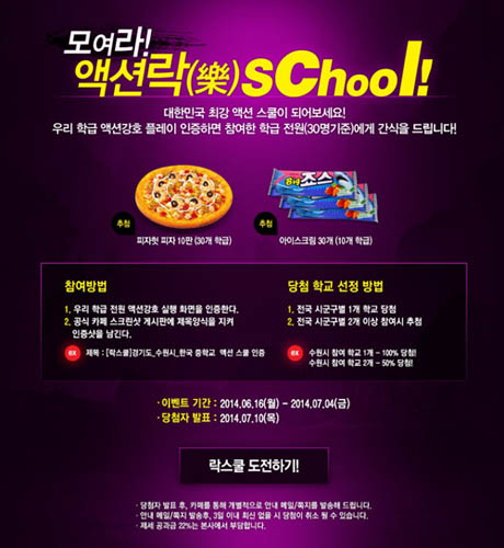 ... 특히 전국 초중고를 대상으로 한 액션락스쿨은 학급 전원이 게임 인증만 하면 간식으로 피자 10판을 배달해 주는 독특한 형식으로 구성되어 있다. 그 외에도 홍보모델 장미여관과 함께하는 국가대표 응원 이벤트도 진행 되고 있다. 한국 경기의 스코어나 승무패를 맞추는 형식으로 장