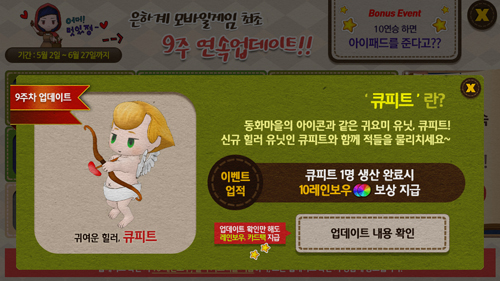 ... 이번 9주차 업데이트 특전으로 큐피트 1명을 생산 완료하면 10 레인보우를 보상으로 얻을 수 있으며 업데이트를 확인만 해도 레인보우와 카드팩을 지급한다. 금번 큐피트 업데이트로 9주간의 연속 업데이트 이벤트가 종료되었고 많은 유저들의 참여와 호응을 받을 수 있었다. 모모에서