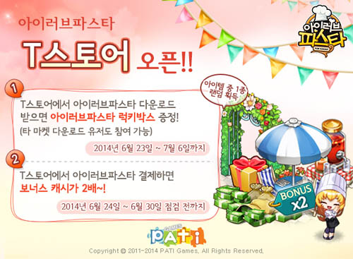... 파티게임즈는 아이러브파스타 for Kakao 티스토어 출시를 기념해 다양한 이벤트를 실시한다. 먼저 티스토어에서 아이러브파스타 for Kakao를 내려받은 모든 이용자에게 럭키박스 아이템(아이템 중 랜덤 1종)을 오는 7월 6일까지 지급한다. 이용자는 티스토어에서 내려받