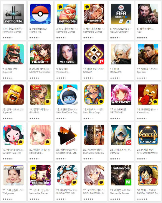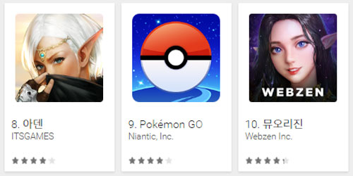 ... 또 포켓몬고는 지난 달 28일부터 구글플레이 최고 매출 순위 2위를 유지하며 흥행 돌풍을 이어가고 있는 상황이다. 두 게임의 뒤를 이어 모두의마블과 세븐나이츠, 피파온라인3M, 삼국블레이드가 3, 4, 5, 6위를 기록하며 선두권 탈환을 꾀하고 있다.