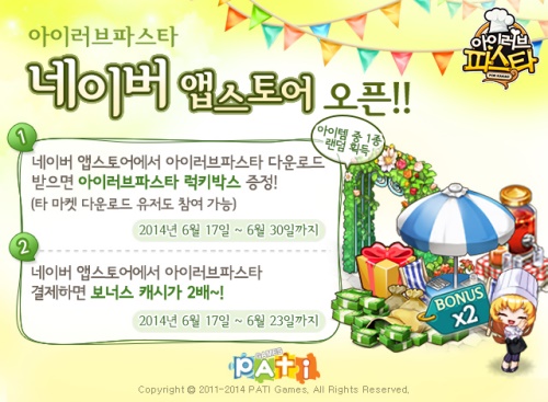 ... 먼저 네이버 앱스토어에서 ‘아이러브파스타’를 내려받은 모든 신규 가입자에게 ‘아이러브파스타 for Kakao’ 럭키박스(게임 아이템 중 랜덤 1종)를 오는 30일까지 증정한다. 또 23일까지는 보너스 캐시 2배 지급 이벤트를 진행한다. 파티게임즈는 네이버 앱스토어에서 ‘