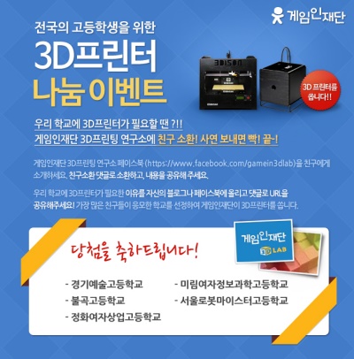 ... 이번 '3D프린터 나눔 이벤트'는 지난 5월 27일부터 총 3주 간 ‘3D프린터가 필요한 이유’에 대한 사연을 공모하는 형식으로 진행됐다. 이벤트는 게임인재단 3D프린팅연구소 페이스북을 통해 총 1만여명 이상에게 구전, 전국적으로 총 10개의 학교, 약 500명의 학생들이