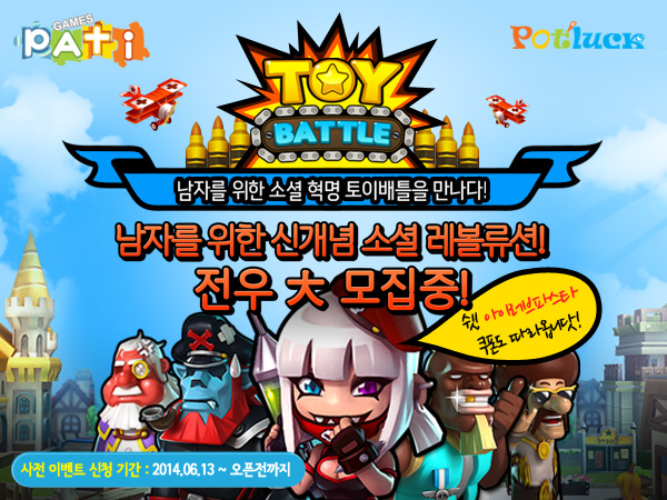 ... 이번 사전등록 예약이벤트는 크게 3가지로 진행되는데 파티게임즈의 인기 소셜게임인 아이러브파스타 for Kakao 럭키박스 쿠폰(캐릭터 카드, 캐시, 퍼즐, 꾸미기 아이템 중 랜덤 1종)을 지급하는 등 푸짐한 선물을 증정한다. 먼저 사전등록을 신청하면 토이배틀 3종 세트 아