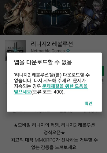 ... 그러나 일부 이용자는 '리니지2 레볼루션' 앱 설치 과정에서 구글플레이 '오류코드 : 400' '오류코드 : 489' 등이 노출되며 설치가 불가능한 문제를 겪고 있다. 오류코드 400의 해결 방법으로는 4가지가 있다. 먼저 LTE와 3G가 아닌 와이파이 연결을 통해 다운