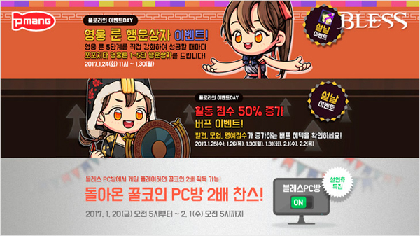 ... 유저들은 게임 플레이 시 획득할 수 있는 ‘세뱃돈 봉투’를 게임 내 NPC에게 전달하거나 유저 본인이 사용함으로써 보상 아이템을 획득할 수 있다. 또한 설 연휴 기간인 27일부터 29일 사흘 동안 게임에 접속하는 유저에게 계정당 1회 아이템이 즉시 지급된다. 특히 설 당일