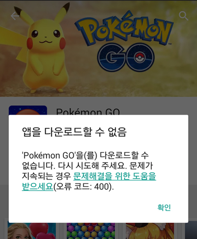 ... 게임을 다운로드 받기 위해서는 한글 '포켓몬고'가 아닌 영어로 'pokemon go'를 입력해야 정식 버전을 찾을 수 있다. 그러나 일부 이용자는 '포켓몬고' 앱 설치 과정에서 구글플레이 '오류코드 : 400' '오류코드 : 489' 등이 노출되며 설치가 불가능한 문제를 겪고