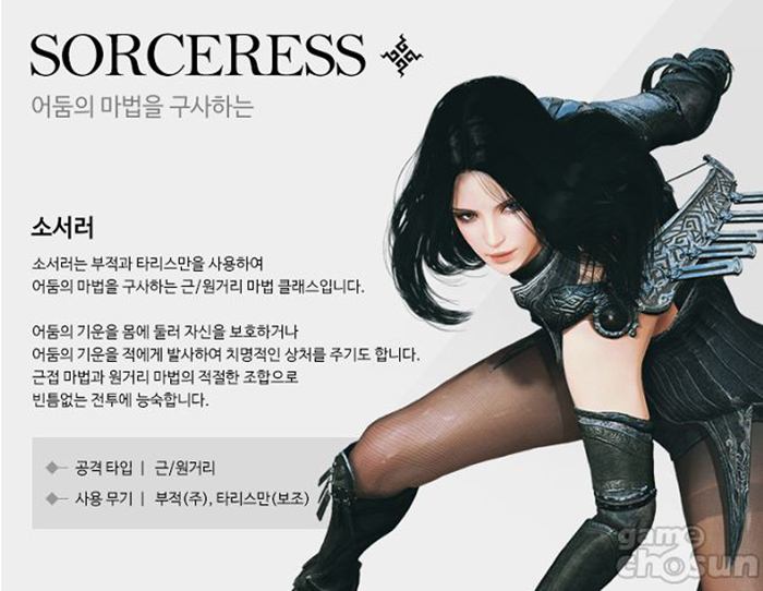 ... 주무기는 부적을 사용하며, 보조무기로는 타리스만을 들고 있으며 이를 통해 어둠의 마법을 구사해 신성한 힘을 사용하는 '발키리', 그리고 마법을 다루는 '위치' 클래스와는 또다른 매력을 갖췄다. 또, 다른 클래스와는 달리 기술 시 사용하는 자원 '어둠의 조각'을 보유하고 있는데
