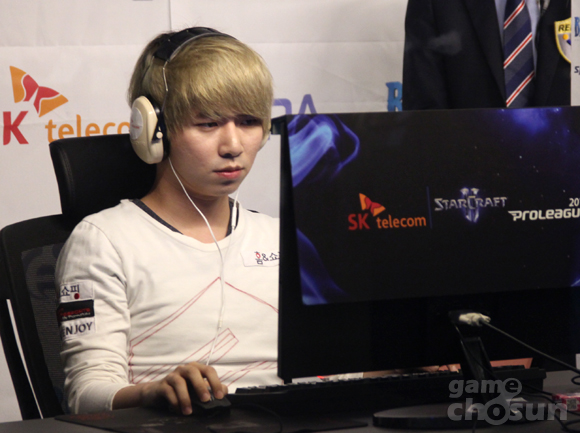 ... 이정훈은 한지원의 앞마당에서 여왕을 확인한 뒤 건설로봇을 후퇴시켰다. 한지원의 발업 저글링은 이정훈의 본진으로 들이닥쳤고, 이 때 이정훈이 병영을 들어올리는 치명적인 실수를 통해 큰 피해를 입고 말았다. 한지원은 이정훈이 해병-불곰 병력으로 타이밍 러시를 시도하자