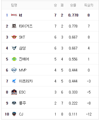 ... 아직 3위인 SKT도 세계 최고 실력을 갖췄다는 평가를 받고 있기 때문에 남은 경기 승리로 정상으로 올라설 수 있을 거라는 게 업계 전문가들의 분석이다. 또 4위와 5위에는 이번 시즌 상승세인 삼성과 진에어가 각각 자리했다. 두 팀은 시즌 초반 시청자들과 관계자들의 예측을 뒤엎