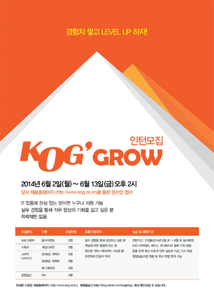 ... 또한 인턴들과의 네트워크를 구축하고 1:1 멘토링을 통한 코칭과 피드백 등을 직접 경험할 수 있다. 임창광 경영관리팀장은 “KOG GROW를 통해 인턴들은 실무 능력을 키울 수 있고 이를 통해 취업에도 도움이 될 것"이라고 말했다. 모집 분야는 ▲프로그래밍 ▲게임 기