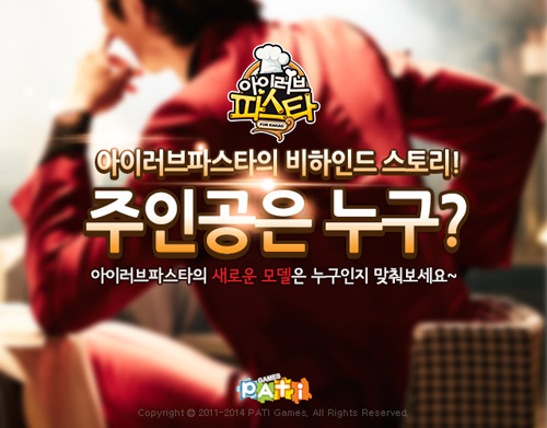 ...com/ilovepastamobile), 공식페이스북(www. facebook. com/ilovepastamobile), 공식 카카오스토리를 통해 게임의 홍보 모델이 의자에 앉아 있는 뒷 모습을 공개했다
