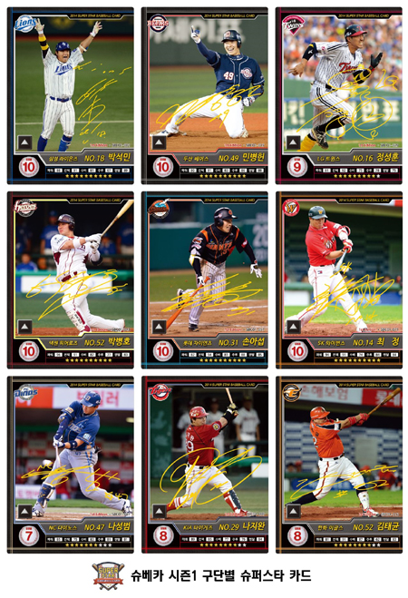 ... 슈퍼스타 베이스볼 카드는 ▲슈퍼스타 카드 ▲빅스타 카드 ▲올스타 카드 ▲노멀 카드 ▲리뎀션 카드 ▲아이템 카드 등 6종류로 제작된다. 우선 ‘슈퍼스타 카드’는 각 구단을 대표하는 선수의 카드로 1장씩 모두 9장만 출시되는 희귀 카드다. 이 카드는 특정 선수의 친필 사인