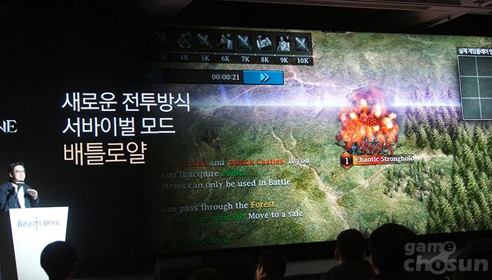 ...강재호 포플랫 대표는 미디어 쇼케이스 현장에서 프레젠테이션을 통해 ‘아이언쓰론’을 소개했다. ‘아이언쓰론’은 다르 전략게임과의 차별성을 위해 풀 3D 그래픽을 게임에 구현했다. 이용자는 자신이 성장시키는 성을 3D 그래픽으로 자세히 살필 수 있으며, 게임의 시간에 따라 밤낮이 바