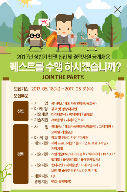 ...웹젠은 사업/ 마케팅/ 기술개발/ 기술지원 부문의 8개 직무에서는 신입사원을, 사업/ 마케팅/ 경영지원/ 게임개발/ 개발지원/ 기술개발/ 기술지원 부문 30개 직무에서는 경력사원을 각각 모집한다. 채용절차는 서류전형 합격자에 한해 필기시험(일부 직무 제외), 실무면접, 인성검사,