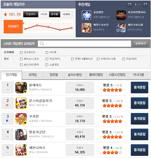 ...kr/game/game_list. php) 내에는 국내 수많은 모바일 게임들이 각 카테고리별로 게임순위가 나열되어 있다. 자신이 좋아하는 게임순위가 궁금한 경우 검색을 통해 쉽게 찾을 수 있도록 검색기능까지 갖추고 있다