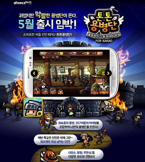 ... 아프리카TV는 ‘톤톤용병단 for Kakao’ 출시에 앞서 이벤트 페이지(tonton. afreecatvgame. com)를 통해 자신의 핸드폰 번호를 등록한 이용자를 대상으로 '플레이스테이션4(PS4)' '갤럭시 기어 핏' '외장하드' '8비트 게임기' 각종 게임 아이템 등