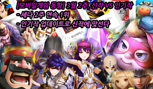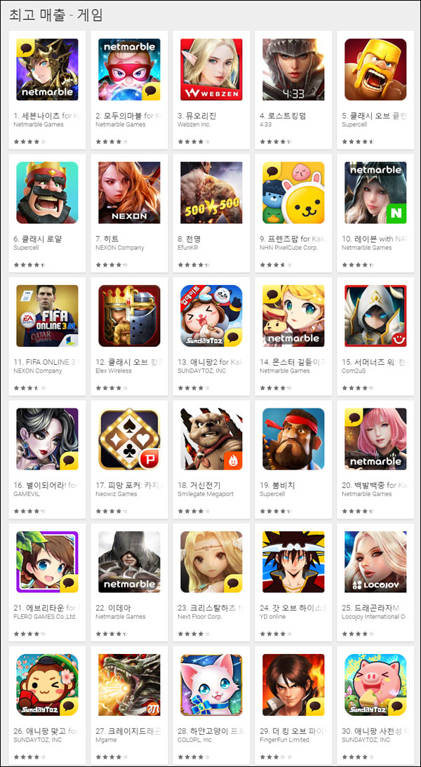 ... ▲ 2016년 3월 13일 구글플레이 게임부문 최고매출 순위 TOP30 먼저 국내뿐 아니라 전 세계 모바일게임 시장을 강타하고 있는 슈퍼셀의 신작 1대1 카드 대전 게임 '클래시로얄'이 최고 4위까지 올라섰으나 넥슨의 인기게임 '히트'가 지난 10일 신규 지역과 외형 장