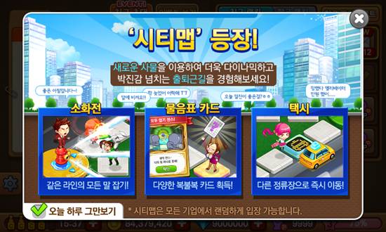 ... 시티맵에는 소화전, 택시 등 출퇴근길에 마주하는 다채로운 사물이 배치되어 있으며, 해당 사물을 이용하면 말이 임의로 위치를 이동하거나 경쟁 말을 잡을 수 있어 역전승의 기회를 제공한다. 시티맵은 승점 보상 등급에 따라 구분되는 초급, 중급, 고급 등 모든 채널에 입장하면 기존