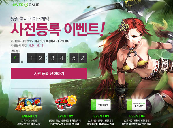 ... 해당 페이지를 통해 사전등록시 각 게임 별로 게임 아이템을 지급하는 혜택을 비롯해 신청자 가운데 매일 1000명을 추첨해 신라면 큰사발을, 모든 게임 설치자 전원에게 네이버 2000마일리지와 네이버 앱스토어 10% 할인쿠폰을 지급한다. [게임조선 편집국 gamedesk@