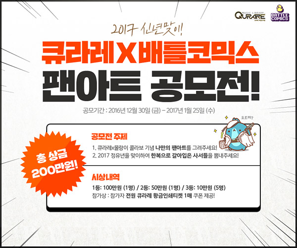 ... 업로드된 팬아트는 인기도와 주최측의 작품성 평가를 합산하여 순위가 결정되며 1등에게는 100만원의 상금이, 2등과 3등에게도 각각 50만원과 10만원의 상금이 수여된다. 더불어, 공모전에 참여한 모든 사람들에게는 ‘큐라레’ 게임내에서 사용 가능한 아이템을 지급한다. 스마일