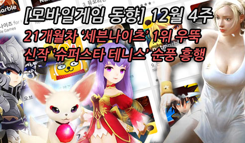 ... 먼저 넷마블의 세븐나이츠는 지난해 12월 26일부터 굳건히 1위 자리를 유지 중이다. 이와 함께 넷마블 게임들이 일제히 순위 상승(혹은 유지)했고 특히 몬스터길들이기는 모처럼 TOP10 안으로 복귀하며 넷마블의 TOP10 점유율은 절반을 넘어섰다. 조이시티의 주사위