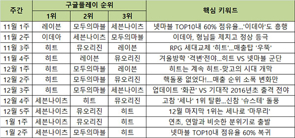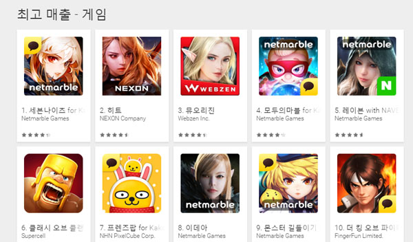 ... ▲ 2015년 12월 27일 구글플레이 게임 부문 최고 매출 순위 세븐나이츠는 지난 2014년 3월 7일 출시한 게임으로 여러 차례 매출 1위에 올랐던 인기작으로 이번 신규 각성 영웅과 펫 등을 추가하는 업데이트로 최고 매출을 달성했다. 그 외에는 소폭의 순위