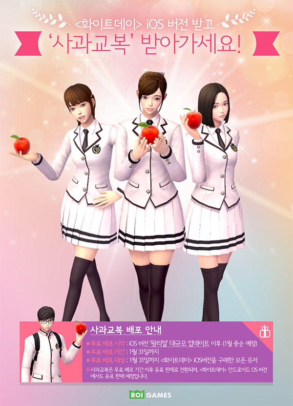... 오는 1월 31일까지 화이트데이 애플 버전을 구매한 모든 유저는 이 사과교복을 무료로 제공받을 수 있다. 관련해 로이게임즈 한 관계자는 "화이트데이는 스토리가 중요한 게임의 특성상 모든 플랫폼을 출시일을 최대한 비슷한 시기를 맞춰야했지만 결과적으로 그러지 못해 iOS유저는