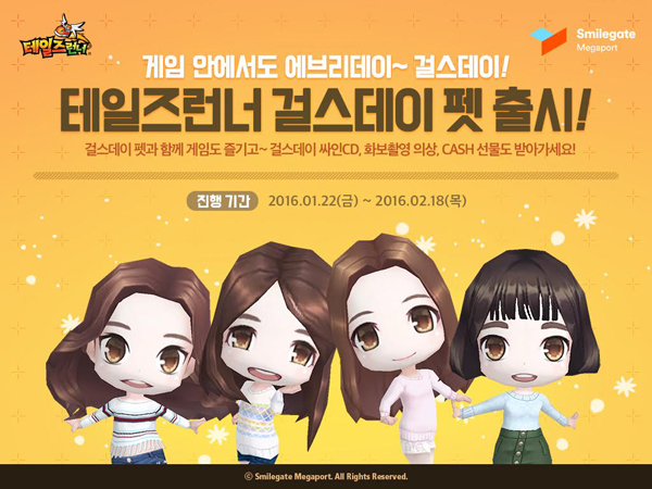 ...회사 측은 ‘걸스데이’ 펫 출시를 기념해 다채로운 이벤트를 진행한다. 먼저 하나 이상의 펫을 구매하는 이용자들 중 50명을 뽑아 ‘걸스데이’ 친필 사인 CD를 증정한다. 또 A등급 펫 4종을 모두 보유하는데 성공하는 이용자 전원에게 ‘걸스데이’ 굿즈, ‘앙리 3세의 선물함’ 아이